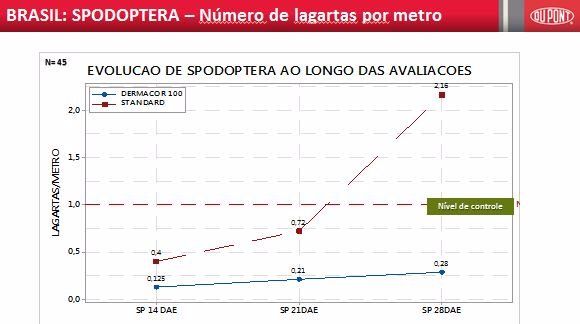 De acordo com a equipe técnica da DuPont, a ação conjunta entre a soja “intacta” e o inseticida Dermacor® supera o tratamento padrão em todos os levantamentos comparativos (ver gráficos a seguir). Um dos dados mais relevantes, dizem os pesquisadores, foi o resultado superior de Dermacor® no controle das pragas Lagarta-elasmo, Spodoptera frugiperda e Helicoverpa armigera.