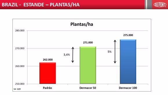 - Em relação à proteção da população de plantas na cultura da soja Bt, o tratamento de sementes com Dermacor® evitou a perda de 9 mil plantas por hectare na dose de 50 ml do inseticida, e de 13 mil plantas/hectare na dose 100 ml. Nas duas doses, o resultado foi superior ao do tratamento padrão.